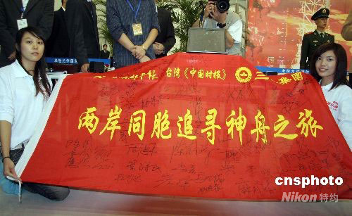 10月1日上午,神舟七號(hào)載人飛船返回艙在其誕生地——中國航天科技集團(tuán)公司所屬中國空間技術(shù)研究院舉行開艙暨搭載物交接儀式,伴隨三位中國航天員太空飛行六十八小時(shí)二十七分鐘的一批特殊“乘客”一一精彩亮相,隨后各歸其主。圖為來自福建、臺(tái)灣各七人組成的兩岸同胞追尋神舟之旅成員們,在開艙儀式上展示有“神七”任務(wù)各系統(tǒng)負(fù)責(zé)人簽名的旗幟,并現(xiàn)場播放隨“神七”飛天歸來的海峽兩岸民眾祝福錄音U盤。中新社發(fā) 孫自法 攝