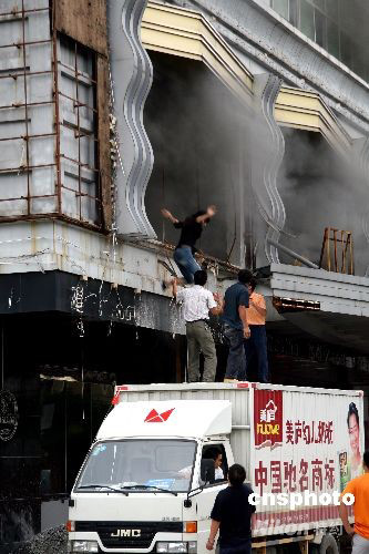 10月5日下午,廣西玉林市瑪田俱樂部在裝修過程中不慎起火,致使正在施工的21名工作人員被困火場,經(jīng)玉州消防大隊(duì)官兵20多分鐘奮力撲救,大火被撲滅,受困人員得以安全疏散。圖為一被困女子跳下路邊貨車逃生。中新社發(fā) 黃詩斌 攝