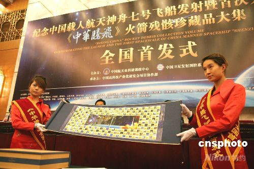 10月7日上午,紀(jì)念中國(guó)載人航天神舟七號(hào)飛船發(fā)射暨首次太空行走《中華騰飛》火箭殘骸郵票珍藏品大集全國(guó)首發(fā)式,在北京人民大會(huì)堂舉行。大集包括四個(gè)部分,第一部分含55克火箭殘骸鑄造的24枚航天題材的“太空郵票”;第二部含120枚“紀(jì)念神七”成功發(fā)射和太空行走的一整張大版紀(jì)念郵票;第三部分含刻有航天員親筆簽名的三枚純金“神七航天英雄”像章;第四部分含嵌有一片珍貴的火箭殘骸及激光內(nèi)雕“神七”三維立體模型的“水晶神七模型”。中新社發(fā) 趙雋 攝