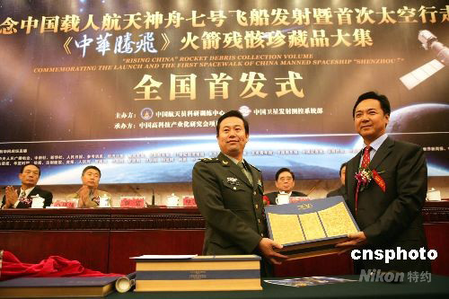 圖為第00081號(hào)《中華騰飛》火箭殘骸郵票珍藏品大集,贈(zèng)送給中國(guó)軍事博物館永久收藏。中新社發(fā) 趙雋 攝