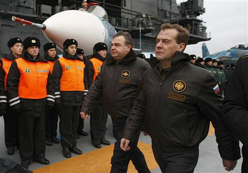 梅德韋杰夫10月11日在巴倫支海域視察了俄北方艦隊“庫茲涅佐夫海軍元帥”號航空母艦,并在這艘航母上觀摩了代號為“德維納”的艦隊軍事演習,演習中一艘核潛艇成功試射了一枚洲際彈道導彈。本次演習是在正在進行“穩(wěn)定-二00八”首長司令部戰(zhàn)略演習框架內實施的。
