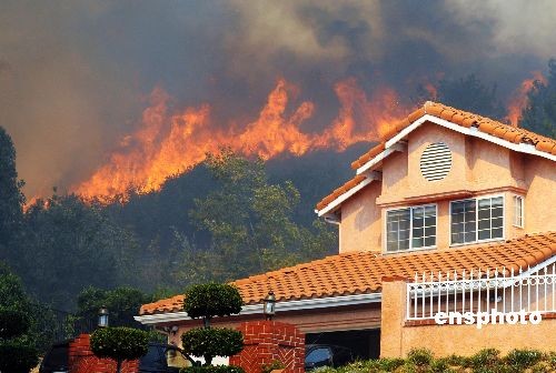 當(dāng)?shù)貢r(shí)間十月十四日中午,消防直升機(jī)在洛杉磯附近的山火現(xiàn)場(chǎng)實(shí)施空中滅火,大批消防員在地面阻止火勢(shì)蔓延。從周一開始,洛杉磯市西北約三十多公里的山區(qū)接連發(fā)生多起山火,由于當(dāng)?shù)毓纹鸫箫L(fēng),火勢(shì)迅速蔓延,難以控制。截至周二下午,過火面積已超過一萬(wàn)四千英畝,山火已造成兩人死亡、四十九棟建筑物被焚毀,上千居民被迫緊急撤離。加州州長(zhǎng)施瓦辛格周一已宣布洛杉磯和溫圖拉縣進(jìn)入緊急狀態(tài)。中新社發(fā) 張煒 攝