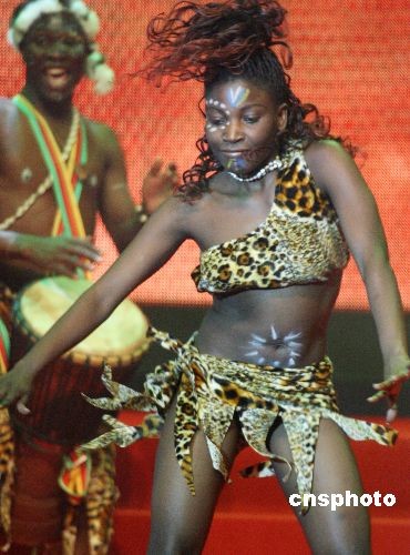 10月16日晚,2008北京大紅門國際服裝節(jié)開幕晚會在北京舉行,晚會匯聚中外模特,展示歐、美、亞時裝新款作品,來自加拿大THE KILL KENNYS樂隊、非洲AFRIACANRYTHM樂團以及中國內(nèi)地歌手等參加演出。圖為非洲歌舞助興北京大紅門國際服裝節(jié)。中新社發(fā) 錢興強 攝