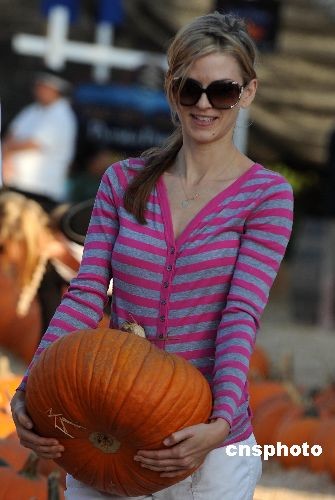 “萬(wàn)圣節(jié)”將至,許多美國(guó)洛杉磯市民來(lái)到遠(yuǎn)近聞名的貝弗利山莊“骨頭先生南瓜田”,選購(gòu)自己中意的南瓜。圖為美女抱得南瓜歸。中新社發(fā) 張煒 攝