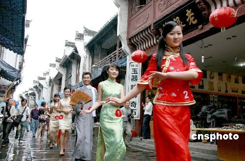 2008年10月22日,黃山魅力青年在屯溪老街舉行風情模特秀。安徽黃山市為提升城市品位,充分展示黃山青年的良好形象,黃山魅力青年首次在千年古鎮(zhèn)的屯溪老街舉行風情模特秀。魅力青年模特在古色古香、徽風遺韻的屯溪老街“秀”出了風情萬種、人與自然和諧共存的美好景象。中新社發(fā) 方也廣德 攝