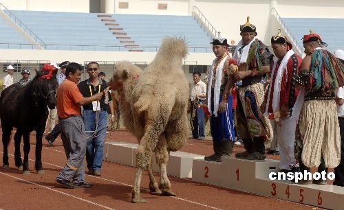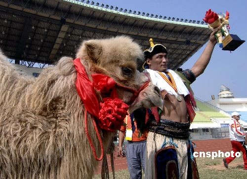 內(nèi)蒙古選手獲得冠軍并獎(jiǎng)勵(lì)駱駝一頭。中新社發(fā) 王東明 攝