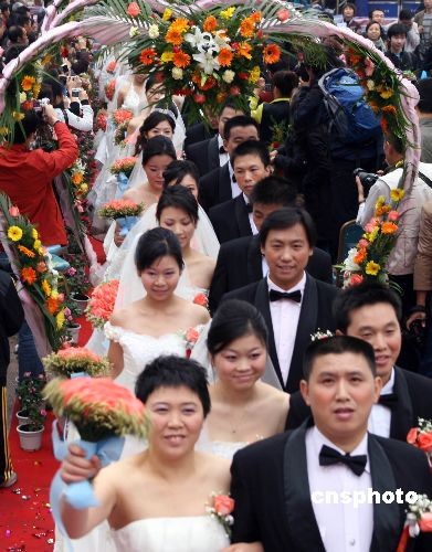 11月2日,重慶農民工日,重慶市為當地農民工舉行集體婚禮,30對進城務工青年在眾多市民見證下結為連理。從2007年開始,重慶市將每年11月的第一個星期日設為“重慶農民工日”,以紀念農民工對該市社會和經濟發(fā)展所做的貢獻。中新社發(fā) 郭晉嘉 攝