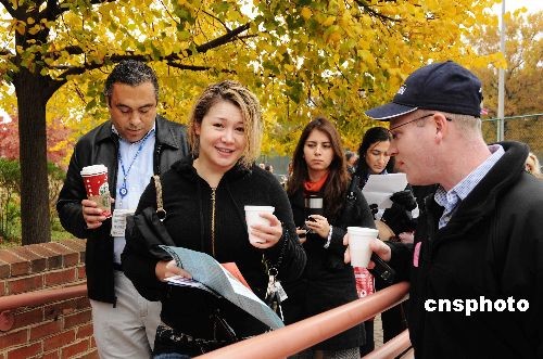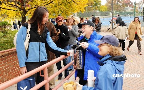 在臨近華盛頓的弗吉尼亞阿靈頓郡中心圖書(shū)館投票站,很多選民因?yàn)槠鸬迷,沒(méi)有吃早飯,此時(shí)來(lái)了兩位送餅干和熱咖啡的?墒,這兩位開(kāi)口就問(wèn):你是奧巴馬的投票者么?一位女士說(shuō)“Yes!”,于是馬上咖啡餅干免費(fèi)奉上。中新社發(fā) 邱江波 攝