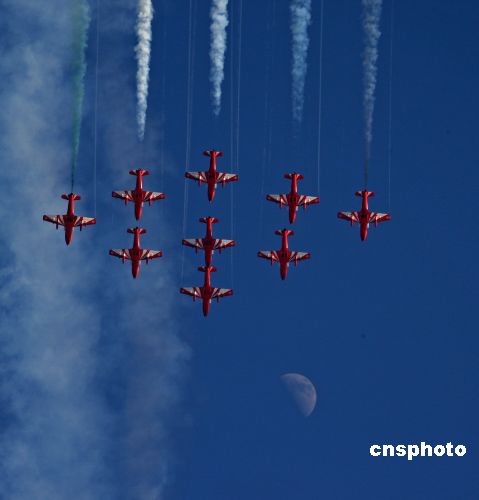 11月6日,印度空軍“陽光”飛行表演隊的9架飛機在第七屆珠!昂秸埂鄙蠟橛^眾作了數(shù)十個飛行科目表演。中新社發(fā) 譚超 攝