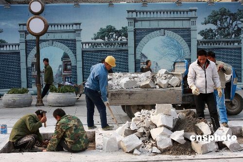 11月14日, 北京前門大街南段,長50米、寬10余米的路段用警戒線圍了起來,施工人員正在對路面及其它設(shè)施進(jìn)行維修保養(yǎng)。屆時,備受關(guān)注的前門大街“鐺鐺車”也已清洗一新,即將載客運(yùn)行,那“鐺鐺”的聲音時隔42年后將再次回到前門大街。8月7日開街以來,前門大街已接待1000多萬的游客,這是開街3個多月來第一次路面保養(yǎng)。中新社發(fā) 鄭雄增 攝