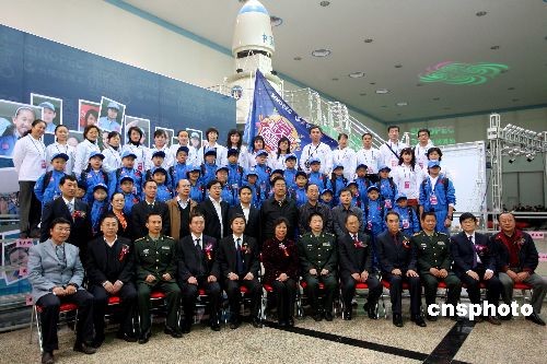 中國(guó)航天員楊利偉、費(fèi)俊龍、聶海勝出席開(kāi)營(yíng)儀式與營(yíng)員合影。中新社發(fā) 盛佳鵬 攝