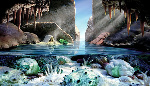 神秘洞穴由花椰菜、角瓜和蝸牛構(gòu)成海底世界,而稻米和意大利粉形成暗礁。在此洞穴里,胡蘿卜從面包巖石懸掛下來充當石鐘乳。