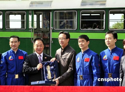 香港旅發(fā)局主席田北俊(中)向“神七”訪港代表團(tuán)贈紀(jì)念品。