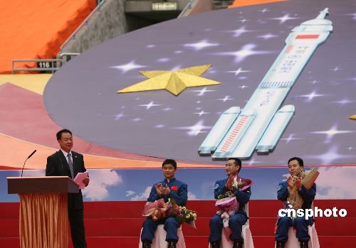 圖為代表團(tuán)團(tuán)長張建啟與神舟七號航天員翟志剛、劉伯明和景海鵬在主席臺上。中新社發(fā) 武仲林 攝