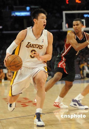 當?shù)貢r間十二月七日晚,NBA洛杉磯湖人隊在主場以一百零五比九十二輕取雄鹿隊,中國球員孫悅首度在NBA常規(guī)賽上登場,共取得四分。在終場前五分十三秒,孫悅上場,每當他拿球,整個斯坦普斯體育場內(nèi)歡聲雷動。中新社發(fā) 張煒 攝