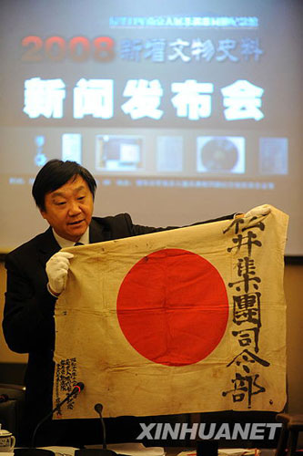 侵華日軍南京大屠殺遇難同胞紀(jì)念館館長朱成山在展示當(dāng)年侵華日軍在南京入城式時作紀(jì)念用的日本國旗。韓瑜慶 攝