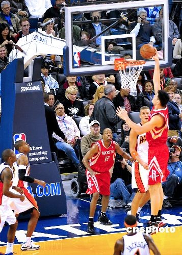 當?shù)貢r間12月12日晚,休斯頓火箭隊與金州勇士隊在加州奧克蘭主場甲骨文體育館進行一場比賽。姚明雖患感冒但仍拿下19分14個籃板,阿泰斯特因為右腳踝有傷休戰(zhàn),1號球星麥格雷迪復(fù)出首發(fā)并表現(xiàn)搶眼,最終火箭以119-108輕松戰(zhàn)勝對手取得兩連勝,時隔一周后再次大勝勇士。目前火箭總戰(zhàn)績達到15勝8負,勇士7勝16負。圖為姚明上籃。中新社發(fā) 陳鋼 攝