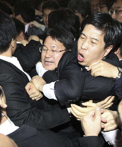 在野黨議員與執(zhí)政黨議員扭打在一起。
