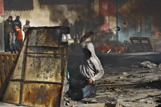 憤怒的巴勒斯坦少年向以色列士兵投擲石子。