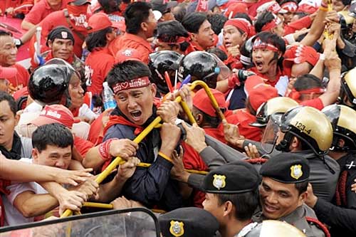 圖:泰國(guó)紅衫軍沖擊警方防線(xiàn)
