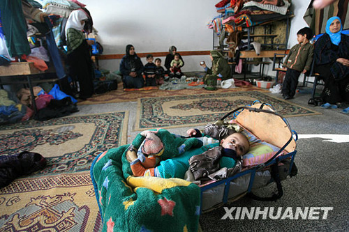 1月3日,在加沙地帶南部拉法,很多巴勒斯坦難民臨時(shí)寄居在一個(gè)難民營(yíng)的學(xué)校里。以色列對(duì)加沙的空襲已造成約470人死亡、2400人受傷。許多巴勒斯坦人家園被毀,流離失所。 新聞圖集:以軍開(kāi)始發(fā)動(dòng)地面進(jìn)攻