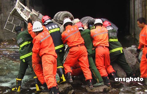 印江消防隊(duì)員正在對掉進(jìn)印江河右岸泄洪洞的貨車實(shí)施救援。 中新社發(fā) 陳曉嵐 攝