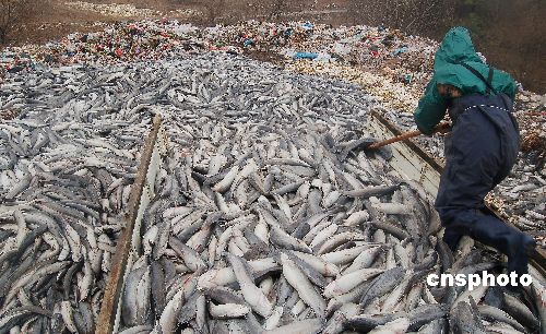 據(jù)工人王中友介紹,1月5日凌晨6時(shí),按常規(guī)尋塘?xí)r,發(fā)現(xiàn)每個(gè)魚(yú)池內(nèi)的鯰魚(yú)全部沉入了水底。中午11時(shí)左右,沉入水底的鯰魚(yú)一個(gè)個(gè)漂在水面,大片死魚(yú)漂滿了魚(yú)池,死亡數(shù)占95%以上。從1月5日中午開(kāi)始,汪功兵組織近20人將死魚(yú)從魚(yú)池中撈上,用兩臺(tái)汽車(chē)向外裝運(yùn)。目前每天只能處理5萬(wàn)斤死魚(yú),大概需要一周時(shí)間才能清理完畢。