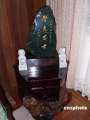圖為七海寓所會客廳里擺放的一塊青石,上鐫刻蔣介石題寫的“賢良慈孝”四個大字。中新社發(fā) 路梅 攝