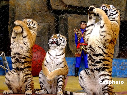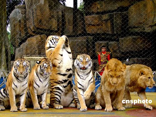 2009年1月29日,廣西南寧動物園的老虎獅子在馴獸員的引導下,直立起來,為游人作揖。還集體排隊走大圈,寓意祝游人“行大運”。
