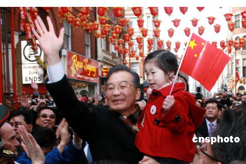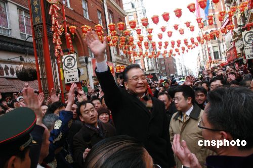 當?shù)貢r間31日下午,中國總理溫家寶抵達倫敦后從機場直接前往唐人街,向華人華僑拜年。