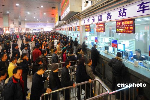2009年2月1日消息,成都車站今年春運(yùn)在原有67個售票窗口的基礎(chǔ)上新增臨時窗口50個,新開設(shè)客票代售點(diǎn)143個,有效分流車站售票壓力。今年成都車站節(jié)后春運(yùn)“買票難”得到明顯緩解。中新社發(fā) 曹寧 攝