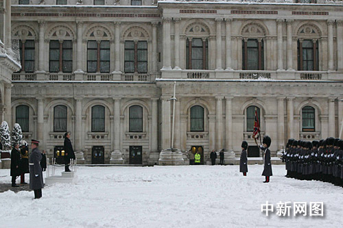 倫敦當(dāng)?shù)貢r(shí)間二月二日上午八時(shí)三十分許,正在對(duì)英國(guó)進(jìn)行正式訪問(wèn)的中國(guó)總理溫家寶,踏雪出席布朗首相在外交部舉行的歡迎儀式。圖為溫家寶在觀禮臺(tái)上檢閱儀仗隊(duì)。 中新社記者 張朔 攝