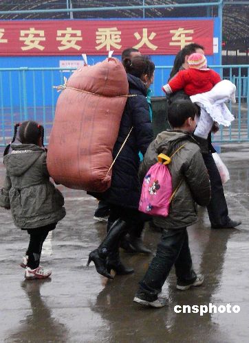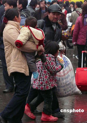 2月2日,春節(jié)過后,在湖北武漢市漢口火車站廣場(chǎng)上,不少農(nóng)民工拖兒帶女乘車外出去打工,讓這些孩子在社會(huì)生活的酸甜苦辣中磨練長(zhǎng)大。中新社發(fā) 李長(zhǎng)林 攝