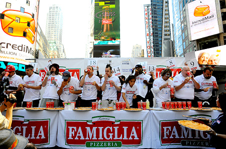 吃披薩大賽:在美國紐約時(shí)代廣場舉行的吃批薩大賽,曾在美國國慶吃熱狗大賽中勇奪冠軍的美國“大胃王”切斯納特(Joey Chestnut)再度出擊,并獲得冠軍。