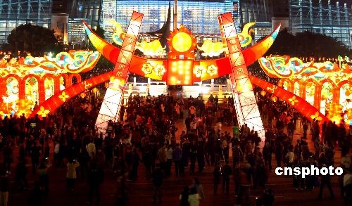 二月五日晚,為期五天的第三屆福州南后街元宵燈會(huì)在五一廣場(chǎng)、南后街同時(shí)正式亮燈,數(shù)百盞花燈呈現(xiàn)出濃濃的節(jié)日氣氛。圖為福州南后街元宵燈會(huì)五一廣場(chǎng)花燈展區(qū),一座50米長(zhǎng)的大型門(mén)燈以及門(mén)燈后的“萬(wàn)象更新”平安廊前人潮涌動(dòng),數(shù)萬(wàn)市民絡(luò)繹不絕的到此觀賞獨(dú)具福州民俗特色的花燈。中新社發(fā) 劉可耕 攝