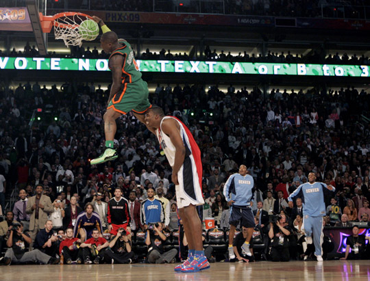 中新網(wǎng)2月15日電 北京時(shí)間2月15日,NBA全明星周末繼續(xù)進(jìn)行,其中深受全世界球迷喜愛的扣籃大賽火爆上演。身高只有1米70的“小土豆”內(nèi)特-羅賓遜在決賽中做出了飛躍上屆扣籃大賽冠軍、身披“超人”斗篷的霍華德后扣籃的動(dòng)作,這個(gè)被稱為“飛躍超人”的扣籃使羅賓遜繼2006年后第二次獲得扣籃王,成為2009年全明星周末的扣籃冠軍。