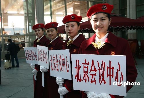 全國“兩會”召開在即,各賓館駐地的服務(wù)員3月1日在北京首都機場準(zhǔn)備迎接各地的代表、委員抵京。中新社發(fā) 杜洋 攝
