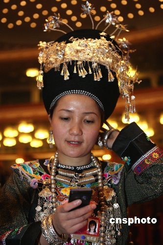 3月4日上午,十一屆全國人大二次會議預(yù)備會在北京人民大會堂舉行。來自重慶市黔江區(qū)的苗族女代表李小燕通過手機向家鄉(xiāng)“播報”大會盛況。中新社發(fā) 任晨鳴 攝