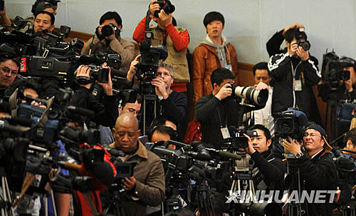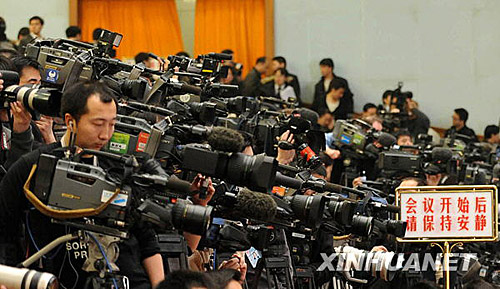 3月5日,第十一屆全國(guó)人民代表大會(huì)第二次會(huì)議在北京人民大會(huì)堂開幕。這是記者在會(huì)場(chǎng)采訪。黃敬文 攝