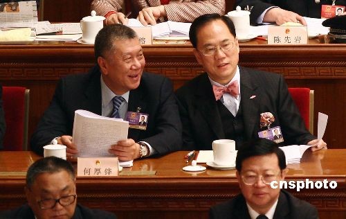 3月5日上午,十一屆全國人大二次會議在北京人民大會堂開幕。香港特別行政區(qū)行政長官曾蔭權(quán)、澳門特別行政區(qū)行政長官何厚鏵列席會議并在主席臺就座。中新社發(fā) 杜洋 攝