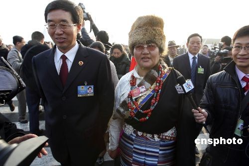 3月5日上午,十一屆全國(guó)人大二次會(huì)議在北京人民大會(huì)堂開(kāi)幕,來(lái)自西藏的全國(guó)人大代表色珠與列席大會(huì)開(kāi)幕會(huì)的西藏自治區(qū)人民檢察院檢察長(zhǎng)張培中步入會(huì)場(chǎng)。中新社發(fā) 盛佳鵬 攝