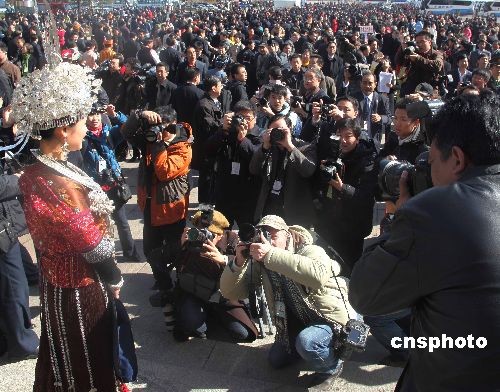 3月5日,十一屆全國(guó)人大二次會(huì)議在北京人民大會(huì)堂開(kāi)幕,身著苗族盛裝的全國(guó)人大代表雷阿幼朵成為攝影記者的拍照的焦點(diǎn)。中新社發(fā) 張婭子 攝