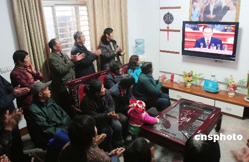 3月5日,江蘇省海安縣海安鎮(zhèn)園莊村的村民們聚集在一起收看“兩會(huì)”現(xiàn)場(chǎng)直播。當(dāng)日,十一屆全國(guó)人大二次會(huì)議在北京人民大會(huì)堂召開,村民們覺得溫家寶總理在大會(huì)上所作的政府工作報(bào)告中提出的一系列惠農(nóng)政策深得人心。中新社發(fā) 周皖芹 攝