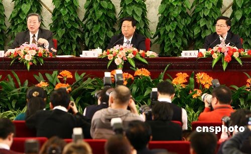 3月6日,十一屆全國人大二次會議在北京人民大會堂舉行記者會,國家發(fā)展和改革委員會主任張平、財政部部長謝旭人、中國人民銀行行長周小川就應(yīng)對國際金融危機(jī)、保持經(jīng)濟(jì)平穩(wěn)較快發(fā)展問題答記者問。中新社發(fā) 杜洋 攝
