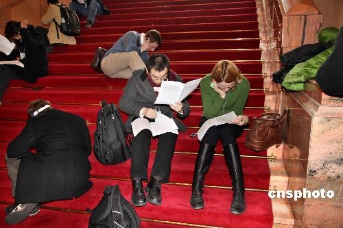 2009年3月5日上午,在北京人民大會堂內(nèi)的臺階上,各國記者忙著發(fā)稿。今年兩會,3000多名中外記者云集北京,外國記者就達(dá)到800多名。今年兩會是平年例會,但報名參加的外國記者與去年換屆之年不相上下。西方主流媒體派出記者人數(shù)增多,如路透社、法新社、彭博社等派出記者人數(shù)都超出了去年的規(guī)模。中新社發(fā) 王保勝 攝