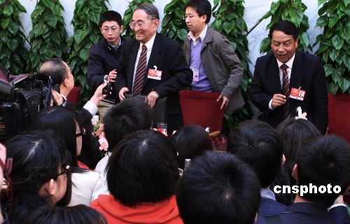 3月6日下午,全國政協(xié)十一屆二次會議記者會在北京人民大會堂舉行,厲以寧、李德水、方方、王文彪、陳錫文五位全國政協(xié)委員到會答記者問。記者會結(jié)束時,被中外記者追堵采訪。中新社發(fā) 宋吉河 攝