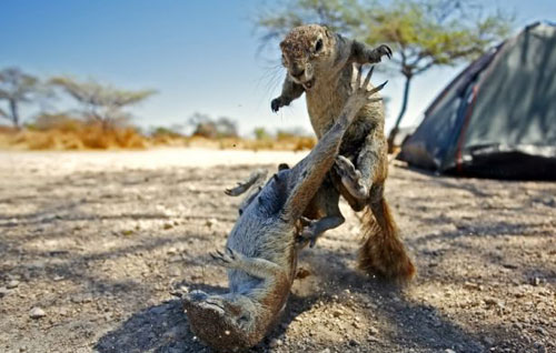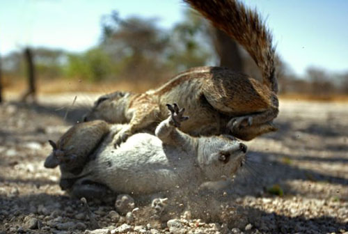 松鼠“耍功夫”。一名叫大衛(wèi)·斯萊特的英國攝影師在納米比亞的埃托沙國家公園拍到了幾只南非地松鼠搏斗的場景。照片拍攝于納米比亞的埃托沙國家公園,一只南非地松鼠正在“教訓(xùn)”一位“入侵者”。對手倒在地上,這只地松鼠毫不猶豫地用它毛茸茸的腿一陣狂踢,以保護(hù)自己領(lǐng)地不受侵犯。
