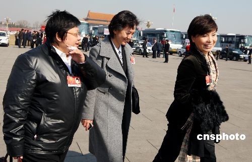 3月8日,眾多女委員在國際婦女節(jié)當(dāng)日出席全國政協(xié)十一屆二次會議第三次全體會議。圖為央視女主持人李瑞英、海霞和歌星韓紅在會后輕松步出人民大會堂。中新社發(fā) 楊可佳 攝