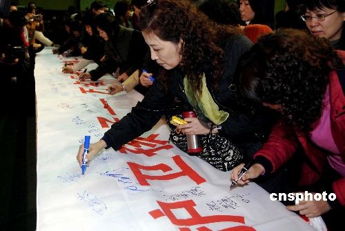 三月八日國際婦女節(jié),由廣東省婦聯(lián)主辦的“凈化網(wǎng)絡(luò)護衛(wèi)孩子--萬名母親網(wǎng)絡(luò)護衛(wèi)行動”啟動儀式,在廣州華南師范大學附屬中學舉行。圖為母親和孩子紛紛簽名支持該項活動。中新社發(fā) 劉衛(wèi)勇 攝