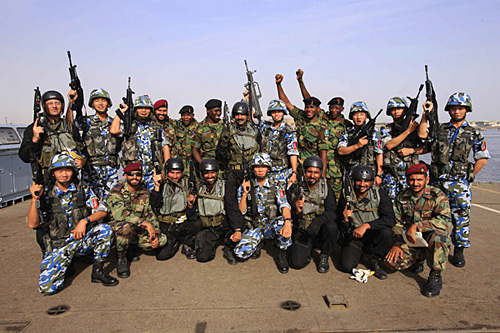 中國(guó)海軍特戰(zhàn)隊(duì)員、巴基斯坦海軍特戰(zhàn)隊(duì)員和尼日利亞海軍特戰(zhàn)隊(duì)員在海上直升機(jī)滑降演習(xí)現(xiàn)場(chǎng)合影。查春明 攝